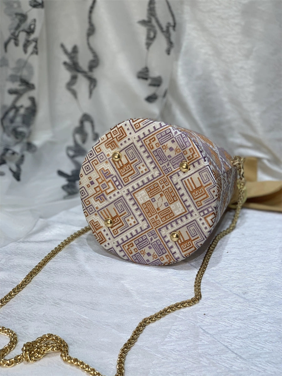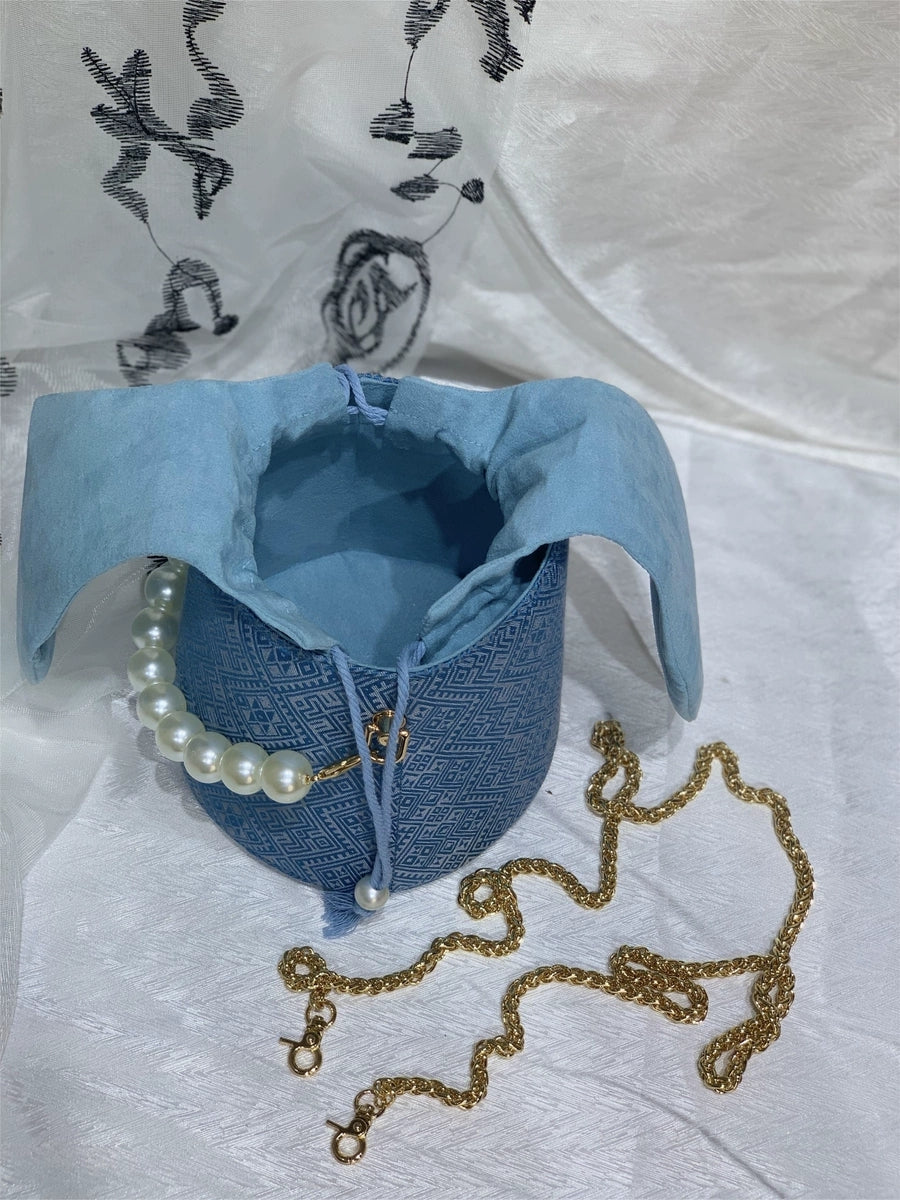 This bucket bag features premium Zhuang brocade—a UNESCO Intangible Cultural Heritage—with intricate geometric patterns. The playful bunny-ear flap, pearl detailing, and handcrafted assembly blend ethnic heritage with a whimsical, modern aesthetic, making it a standout accessory.