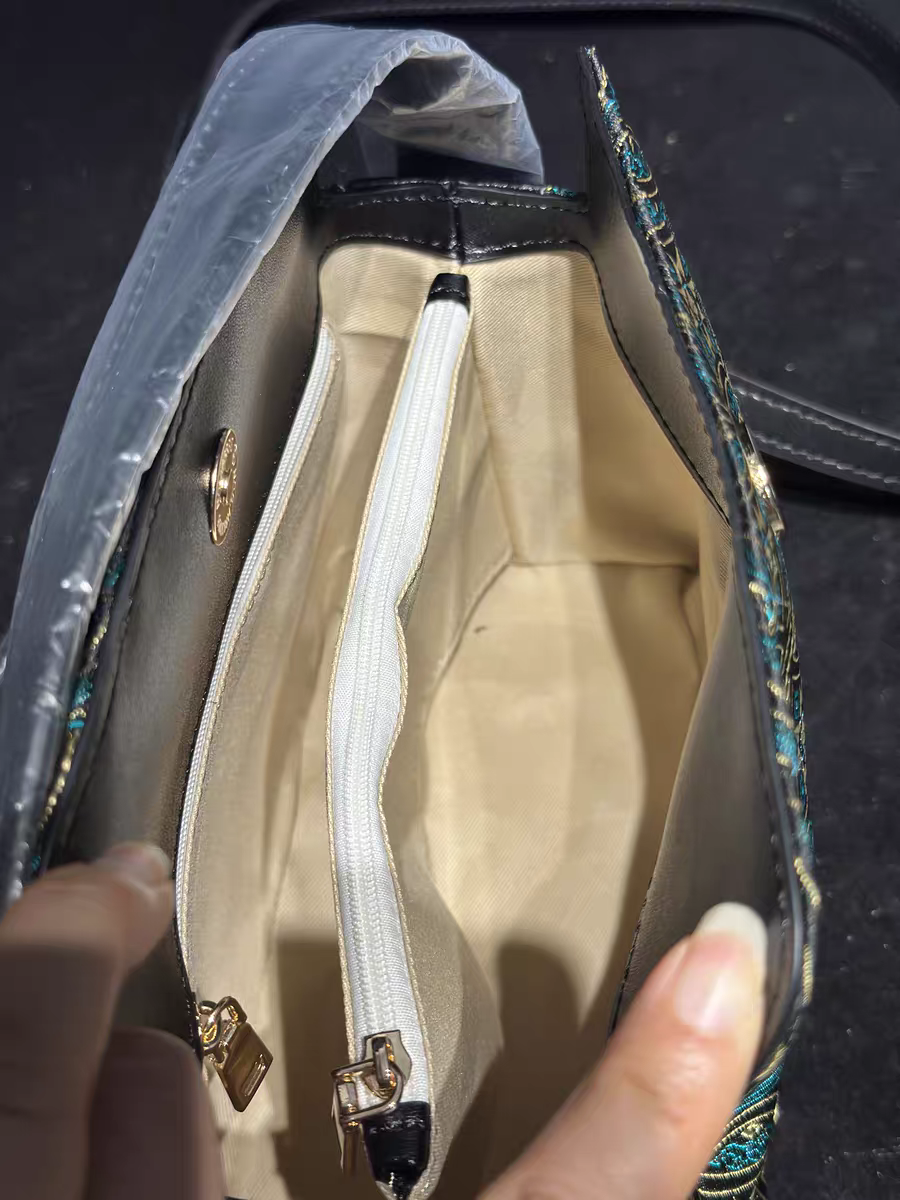 - Hardware & Straps: Gold-toned metal accents and an adjustable black vegan leather crossbody strap, blending traditional art with modern functionality. The handle comes with protective film (to be removed after unboxing) for pristine condition.