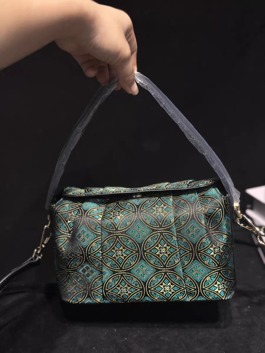 This mini bag is adorned with the Songcaiwen (Wealth-Bringing Pattern)—a revered motif in Zhuang brocade, a UNESCO Intangible Cultural Heritage. The intricate teal and gold geometric designs aren’t just embroidery; they’re a centuries-old legacy of the Zhuang people, symbolizing abundance, protection, and artistic mastery.